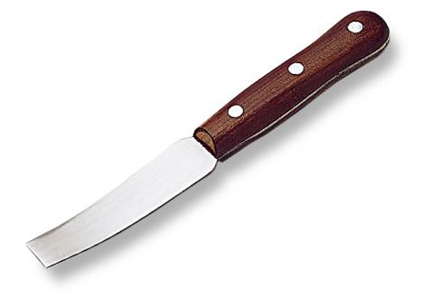 Kittelőkés. Tompa, hajlított, fényesre polírozott, markolaton átfutó penge. Barna, polírozott famarkolat. Pengehossz: 95 mm. Szélesség: 18 mm.